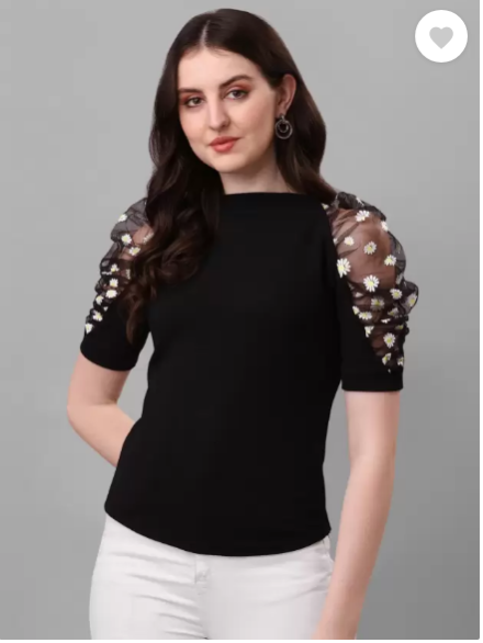 Casual Puff Sleeves Solid Women Black Top